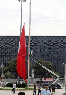 Soma'da maden ocağındaki yangının ardından ilan edilen milli yas dolayısıyla tüm kurumlarda bayraklar yarıya indirildi. Manisa'nın Taksim Meydanı Atatürk Kültür Merkezi önünde dalganan dev Türk Bayrağı da görevliler tarafından yarıya indirildi.